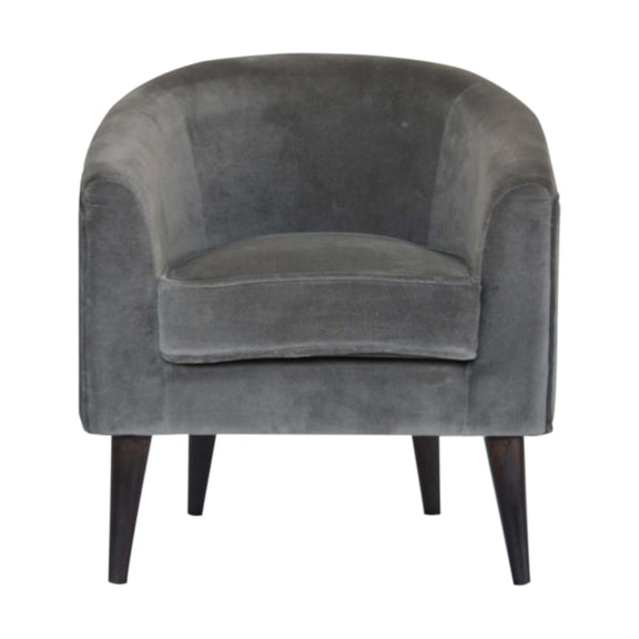 A modern tub chair softened with steel grey soft velvet. Carved from 100% solid mango wood, this beautifully shaped chair celebrates the strength of craftsmanship while keeping its aesthetic light and elegant. Its curved silhouette, tapered legs, and low seat make it an easy companion in living rooms, bedrooms, or reading corners.